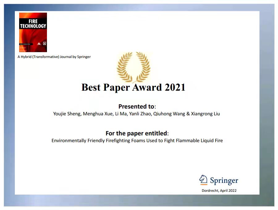 近日,美国消防协会和消防工程师协会会刊《Fire Technology》公布了2021年度最佳论文入选名单,十大外围足球平台app青年教师盛友杰的文章“Environmentally Friendly Firefighting Foams Used to Fight Flammable Liquid Fire”获得了该期刊2021年度最佳论文奖,华人作者发表的论文仅此一篇入选。