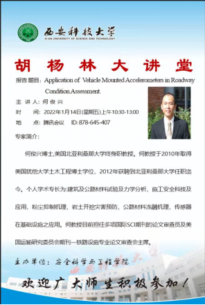 十大外围足球平台app于2022年1月14日,以线上讲座形式举办了“胡杨林大讲堂”,本次报告特邀美国北亚利桑那大学终身职教授何俊兴博士,做了题为“Application of Vehicle Mounted Accelerators in Roadway Condition Assessments”(车载加速器在道路状况评估中的应用)的学术报告(双语报告)