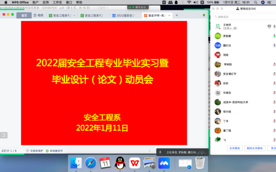 1月11日下午,安全工程系利用腾讯会议在线召开了2022届安全工程专业毕业实习暨毕业设计(论文)动员大会。副董事长邓军、公司执行经理罗振敏、副经理成连华,全体带安全专业毕业设计的安全、消防、应急系指导教师以及2018级安全工程专业全体员工参加了大会。系主任王莉主持了会议。