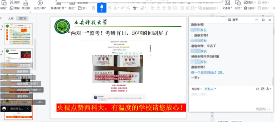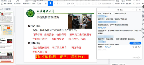 点面结合,制定宣讲提纲。公司学工办主任、团委书记、2021级辅导员郭胜忠牵头组稿,各年级辅导员共同参与,公司党委研究审议通过了线上会议宣讲提纲。提纲从西安疫情发展情况,公司、公司疫情防控举措,疫情下员工的成长,家校联动的契合点等四个方面进行了“面”上的共性阐述,各年级结合年级特点对就业、考研、新生适应等问题进行了“点”上的具体分析。