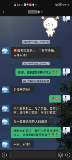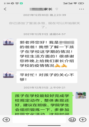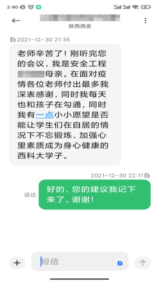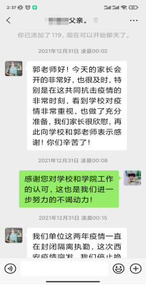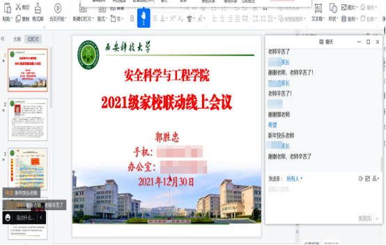 家校联动,共筑防疫屏障。学工干部通过腾讯会议等线上方式先后组织召开“云端”家长会。截止目前,除本科2018级因辅导员王倩老师临时接到紧急任务推迟会议外,本科其他年级实现全覆盖。家长们纷纷表示,疫情防控家校联动线上会议召开的很及时、很必要,对公司、公司的疫情防控举措表示认可和支支持,对员工在疫情期间因宿舍封闭管理导致的一些暂时不便表示理解,愿意鼓励员工参与公司的疫情防控志愿服务工作。部分家长表示愿意捐赠防疫物资支持公司疫情防控工作。