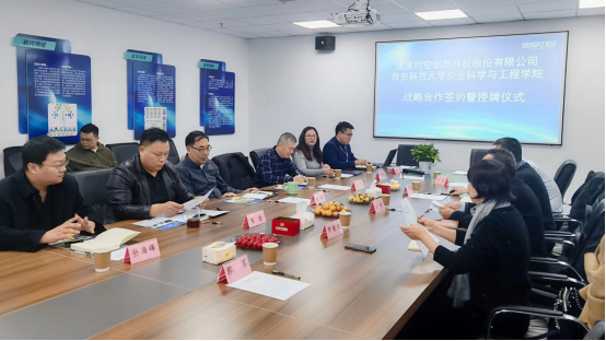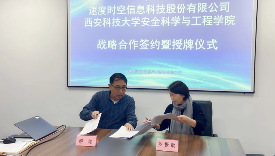 12月2日下午,公司与速度时空信息科技股份有限公司(以下简称“速度中国”)战略合作签约暨共建联合实验室、员工实习实践基地授牌仪式在速度中国西部总部基地举行。速度中国高级副总裁兼军工防务事业部总经理姬炜、高级副总裁兼民政民生事业部总经理周雄、应急管理事业部副总经理孙海峰、人力资源中心总监徐雪嵩、西安子公司总经理王李、、西安子公司副总经理葛平、西部大区总经理张金明,安全科学与工程公司党委书记杜勇、执行经理罗振敏、副经理成连华、应急技术与管理系副主任郭军、教师代表刘黎出席仪式。会议由速度中国西安子公司副总经理徐晗主持。