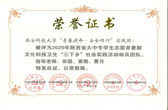 “青春使命·安全同行”实践团获批2019年全国百强实践团队,获2019、2021年陕西省优秀团队、2020年陕西省标兵团队;获陕西高校“万名学子扶千村”社会实践脱贫攻坚专项活动三等奖。志愿服务项目获陕西省青少年公益项目大赛三等奖;员工作品获“挑战杯”红色专项赛全国三等奖1项、省级一等奖、三等奖各1项;获陕西高校心理剧比赛一等奖、三等奖各1项。开展的相关活动被新华网、光明网、中国青年网、陕西省教育厅、云南电视台、陕西新闻网等媒体报道。
