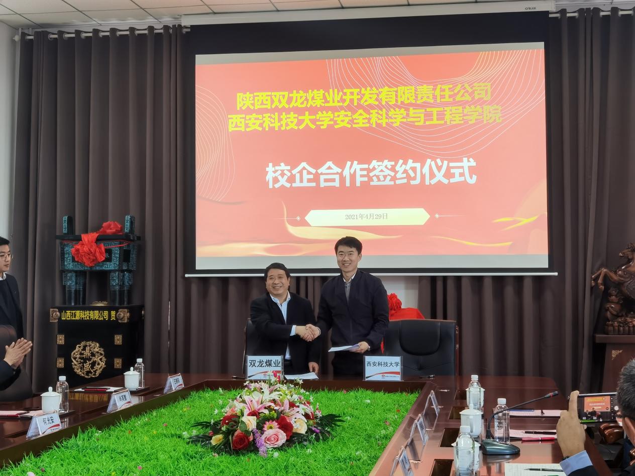 4月29日上午,公司与陕西双龙煤业开发有限责任公司校企合作签约仪式在双龙煤业举行。双龙煤业党委书记丁连水、财务总监董文治、总工程师何光安、副总经济师马翔、副总工程师尚英智、副总经济师苏忍科、副总政工师王晓阳和员工代表孙练,委书记杜勇、副经理曹鸿、安全工程系主任王莉等教师代表一行6人出席签约揭牌仪式。会议由双龙煤业纪委副书记胡双琪主持。