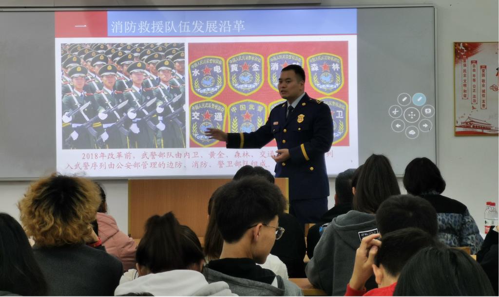 11月17日晚上,十大外围足球平台app“消防月”系列讲座在临潼校区骊山校园3号教学楼404开讲。第一讲邀请中国消防救援公司训练部参谋贺松指挥员为消防救援系同学做题为“国家综合性消防救援队伍人才培养发展展望”的专业报告,报告会由消防救援系副主任赵婧昱主持。