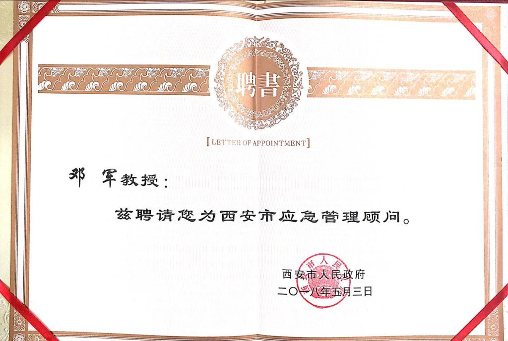 西安市人民政府聘任邓军教授为“西安市应急管理顾问”