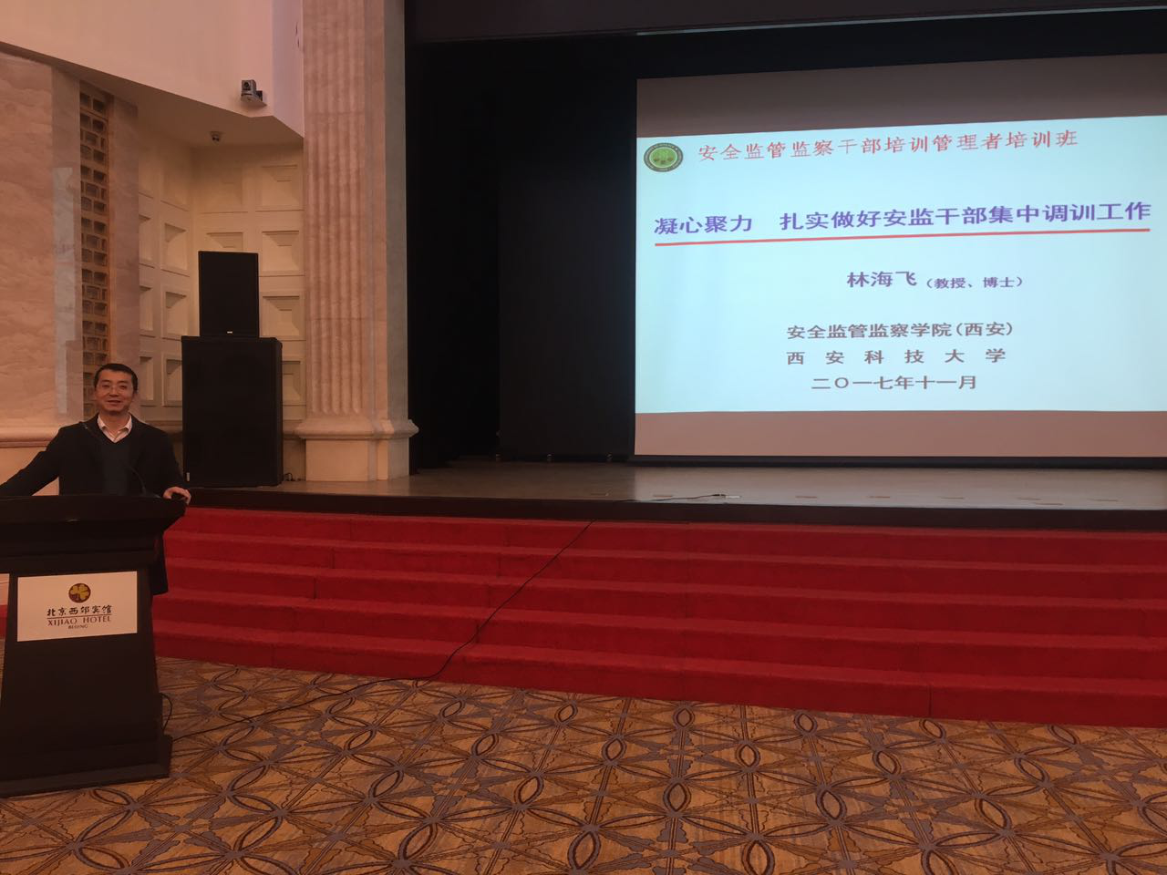林海飞代表公司做为全国四所安监公司唯一的代表在培训班经验交流会上作了题为“凝人聚力 扎实做好安监干部集中调训工作”的经验交流,从 公司团队建设、组织管理、后勤保障、评估评价等多方面全方位的将安监公司2017年度的集中调训工作向国家安全监管总局及各省市安监局干部作了总结汇报。