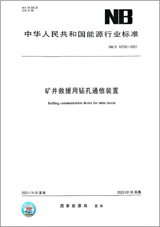 近期,国家能源局发布了由十大外围足球平台app矿山应急救援团队牵头起草的中华人民共和国能源行业标准《矿井救援用钻孔通信装置Drilling communication device for mine rescue》NB/T 10752-2021。