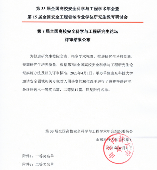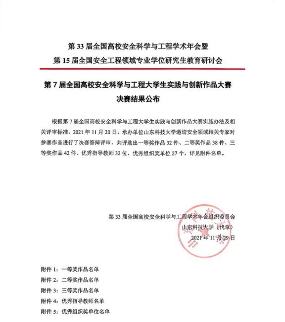 近日,第33届全国高校安全科学与工程学术年会暨第8届全国高校安全科学与工程老员工实践与创新作品大赛、第7届全国高校安全科学与工程研究生论坛决赛成绩揭晓,十大外围足球平台app选送的5支队伍脱颖而出,斩获老员工实践与创新作品全国一等奖3项、二等奖1项、三等奖1项,研究生论坛获全国二等奖2项。