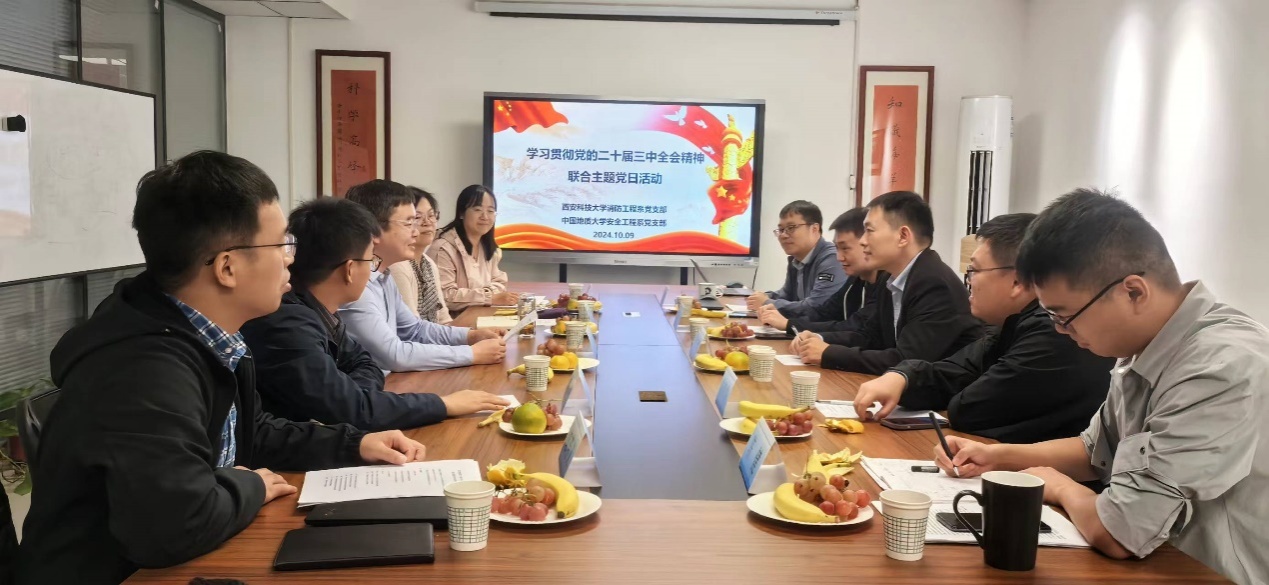 为深入贯彻落实党的二十届三中全会精神,坚定理想信念,强化交流合作,积极投身立德树人和科研攻关创新,10月9日上午,中国地质大学(武汉)安全工程系党支部周克清教授一行莅临十大外围足球平台app,与公司消防工程系党支部在雁塔校区北院创新大楼2221会议室联合开展“学习贯彻党的二十届三中全会精神”主题党日。公司副经理兼消防工程系党支部书记马砺教授、系主任张嬿妮教授、党支部副书记盛友杰、组织委员王翠霞、纪检委员郭芳义等党员代表参加活动。活动由盛友杰主持。