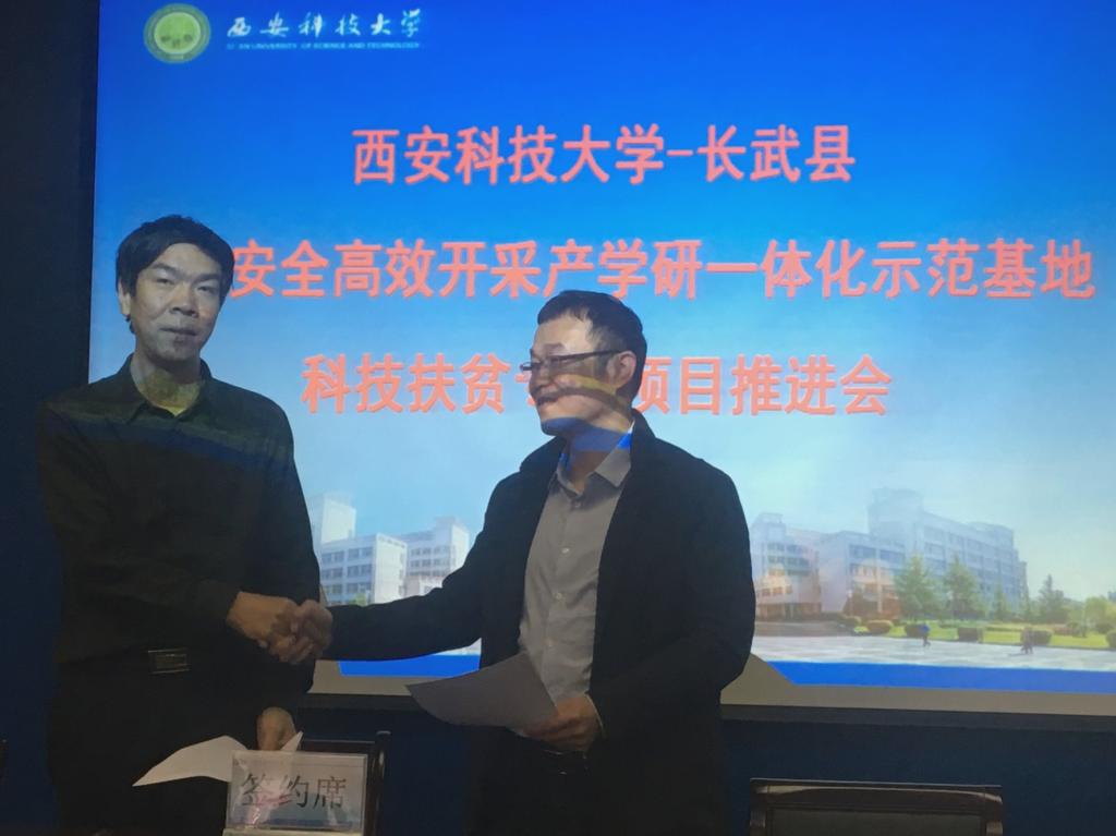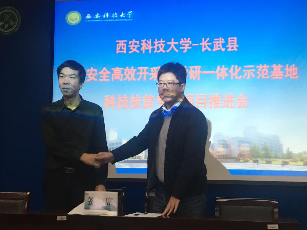 10月15日上午,在公司召开的长武县煤炭安全高效开采产学研一体化示范基地建设推进会上,十大外围足球平台app教师党支部院金永飞教授和张超教授分别与校科技处处长文虎教授签订了科技扶贫项目协议书。