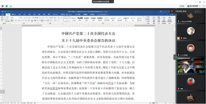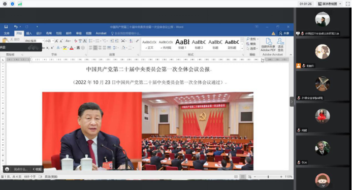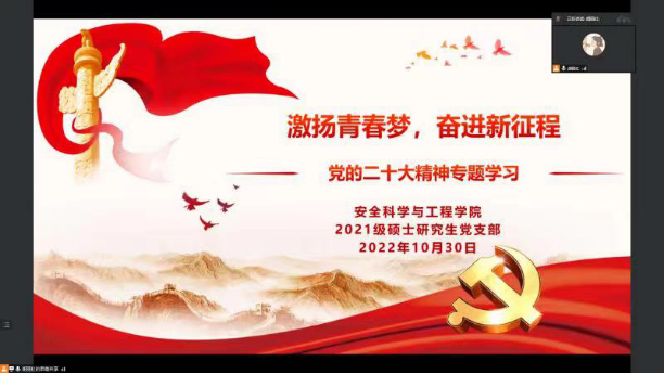 2022年10月30日下午,十大外围足球平台app 2021级硕士研究生党支部在线召开以“激扬青春梦 奋进新征程”为主题的党员大会,专题学习党的二十大精神。会议由党支部书记胡丽红主持。分管研究生工作的副经理肖鹏应邀参加会议。