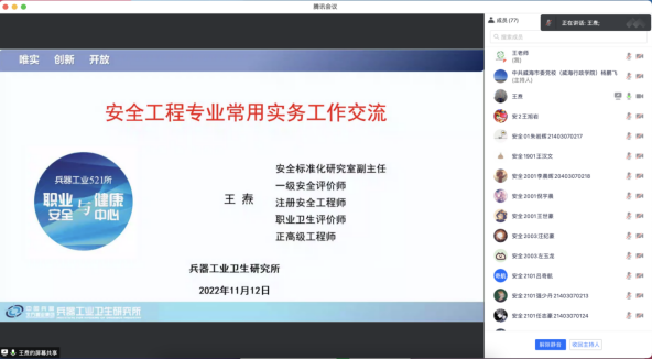 王焘以《安全工程专业常用实务工作交流》为题,结合多年军工行业安全工作经验,分析了当前安全生产工作面临的形势,对安全工程专业的就业方向、安全评价、安全生产标准化、双重预防机制建设、事故应急预案编制等内容进行了重点讲解和在线交流。