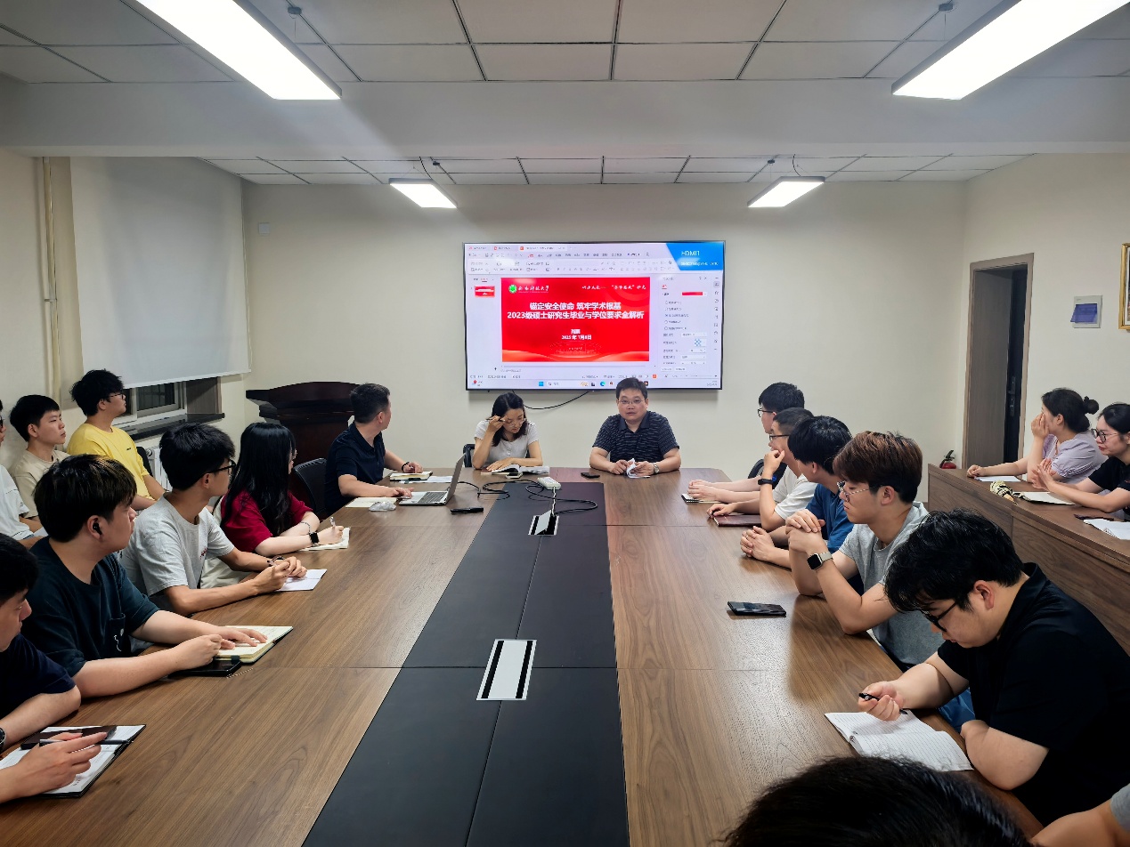 肖鹏在总结时强调,全体研究生要坚守学科使命,践行安全人的责任与担当。要加强规章制度的学习,把握学位申请的流程节点,制定“毕业倒计时计划”。要坚持实事求是,践行严谨作风,遵守学术道德。要提高思想认识,统筹好学业与就业的关系,以优异的学术成果和高质量的就业致敬青春。