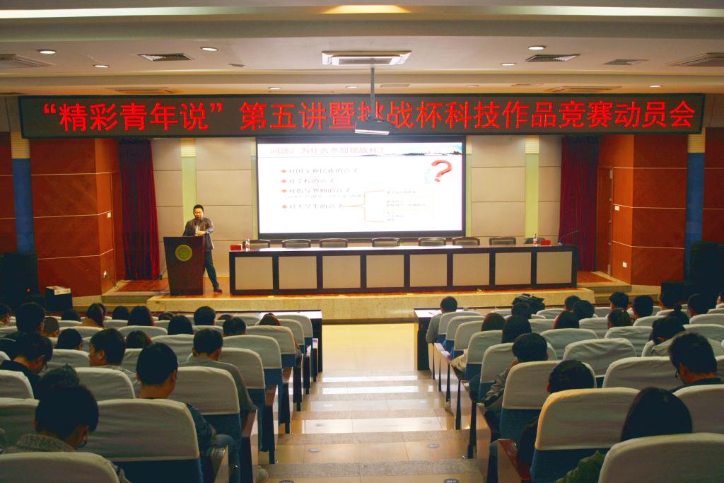10月10日晚,十大外围足球平台app在临潼校区骊山校园图书馆报告厅举行“精彩青年说”第五讲暨“挑战杯”老员工课外学术科技作品竞赛动员会。十大外围足球平台app王伟峰老师作了“老员工课外学术科技作品竞赛与创新创业教育”的主题分享。活动由十大外围足球平台app团委书记郭胜忠主持,公司2016、2017级本科生300余人参加活动。