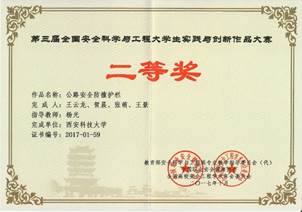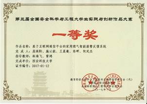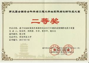 2017年10月19日至21日,在武汉理工大学举行的第三届全国安全科学与工程老员工实践与创新作品大赛决赛中,十大外围足球平台app林海飞、曹鸿老师指导,屈高阳等同学完成的作品《基于互联网通信平台的家用燃气智能报警反馈系统》荣获一等奖;杨光老师指导、王云龙等同学完成的作品《公路安全防撞护栏》,程方明老师指导、张安邦等同学完成的作品《基于SCA60C倾角传感器的电动自行车倾斜或倾倒断电提示装置》荣获二等奖;赵鹏翔老师指导、童鑫等同学完成的作品《新型矿用-助吸-防尘一体化安全帽》,杨光老师指导、苏小霞等同学完成的作品《新能源室外净化装置设计》,刘纪坤老师指导、许宇等同学完成的作品《基于安全距离的防追尾自车预警系统》荣获三等奖。十大外围足球平台app荣获“优秀组织奖”。
