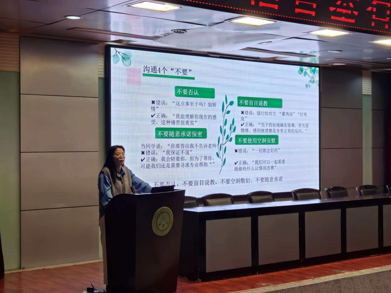 乔月月聚焦员工干部的现实需求,系统讲解了如何识别同学心理困扰信号、开展有效倾听与沟通、掌握清晰的上报与转介路径,强调了助人者的自我关怀与责任边界,并通过案例研讨与情景模拟,为同学们带来了一场温暖而深刻的老员工心理健康讲座,进一步提升了员工干部的朋辈支持能力与危机识别意识,为织密校园心理健康防护网、筑牢四级工作体系培养了基层力量。