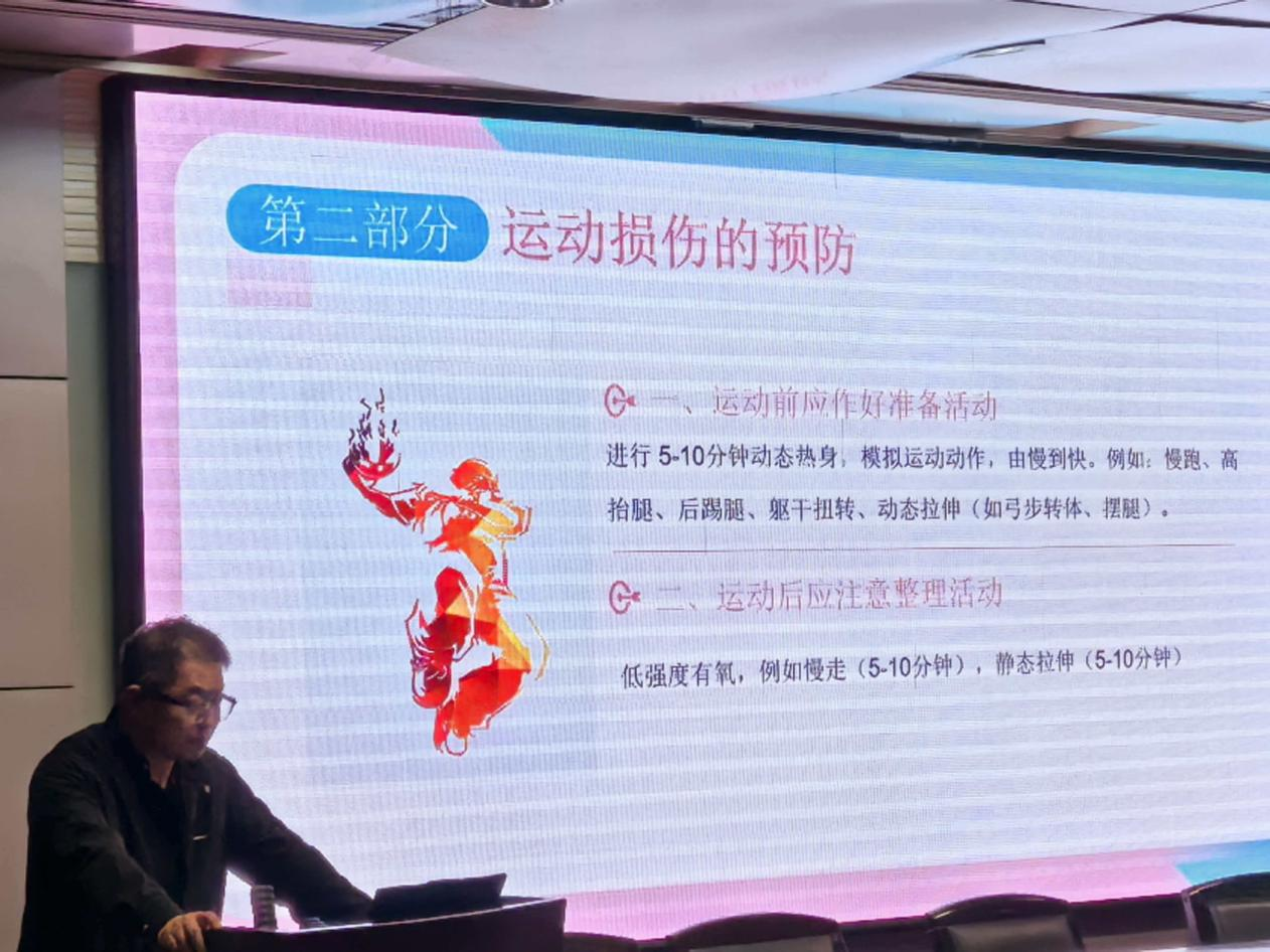 杨永利以“运动损伤、预防和处理”为主题,通过图文并茂的PPT和现场模拟,详细讲解了运动前科学热身、运动中自我保护、常见损伤如扭伤、抽筋的及时处理办法,重点演示了心肺复苏(CPR)的关键步骤,并提醒运动员们:“了解极限、尊重身体,才是对自己真正的负责。”