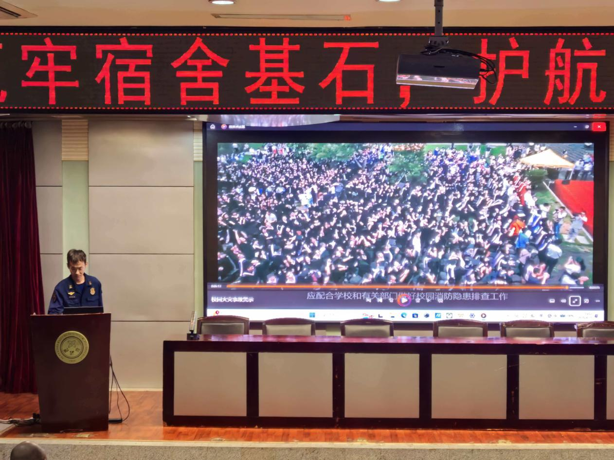 田季力通报了近期高校火灾案例,重点剖析了宿舍使用违规电器、私拉乱接电线、充电宝不当使用等隐患,现场展示了灭火器的正确操作步骤。田队长语言风趣、案例鲜活,“教训就在身边,安全握在手中”的呼吁,深深印在每位同学心中。